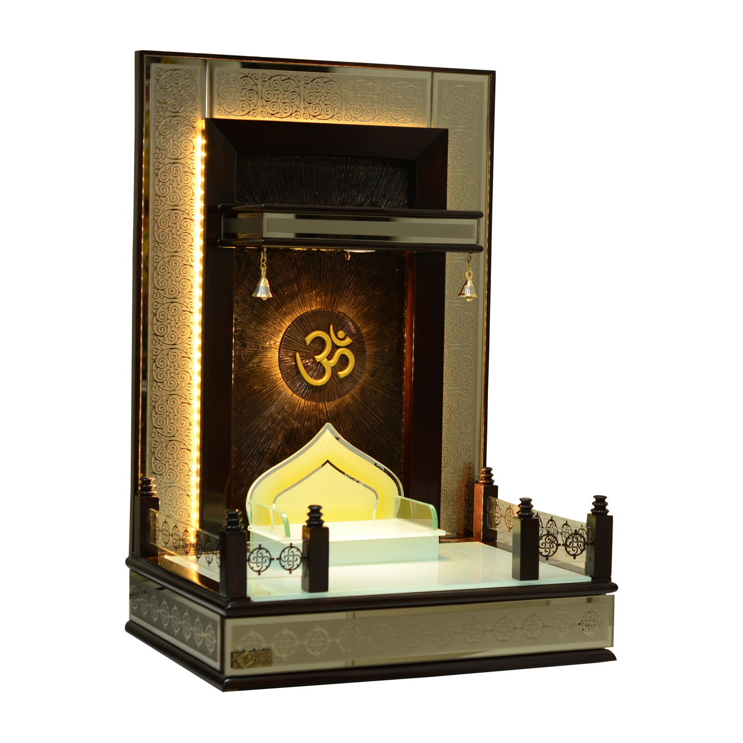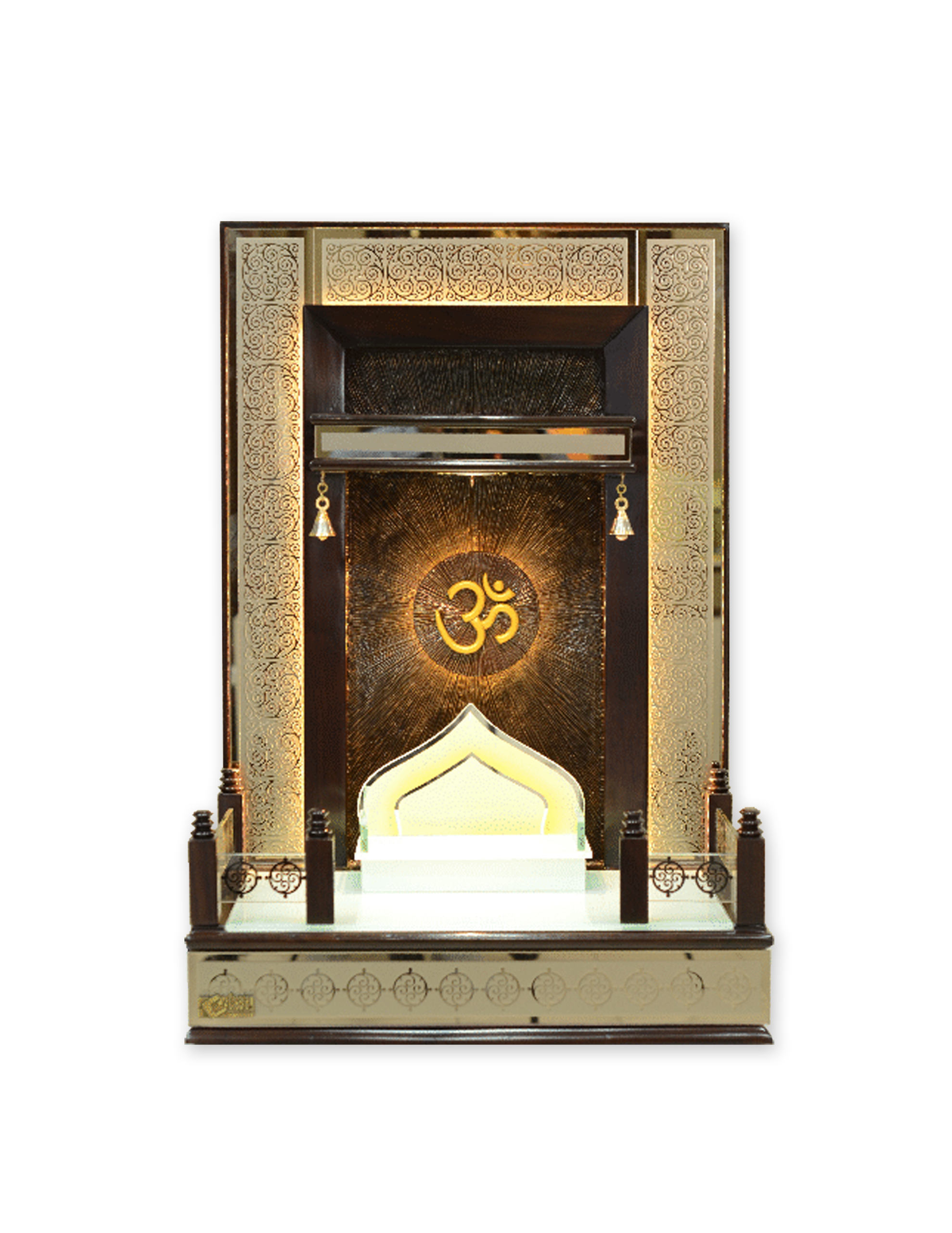 • Divine Illumination: Integrated LED lighting strips and a backlit central “Om” provide a warm, meditative glow perfect for your puja room design.