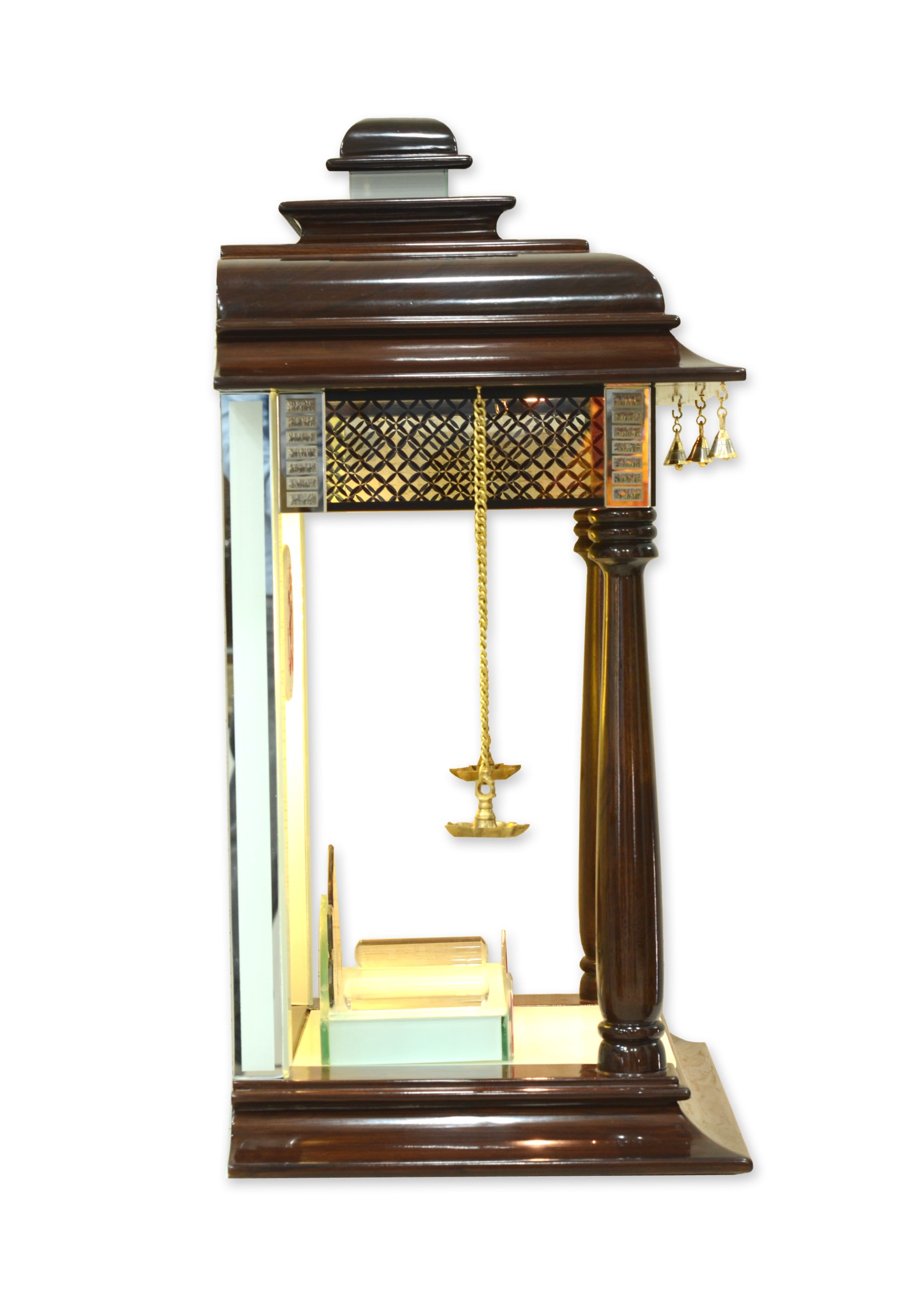 • Decorative Accents: Features two beautiful hanging brass diyas and bells that add a traditional sound and light element to the temple.