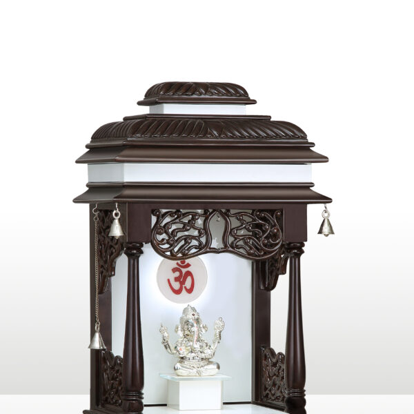 Maximize your spiritual space with the  SMALL(YM) wooden mandir, expertly crafted from high-quality teak wood. This compact yet elegant temple features a striking dark walnut and white dual-tone finish, a traditional carved arch, and a glowing “Om” backdrop. It is the ideal wooden mandir for modern apartments and smaller pooja corners.