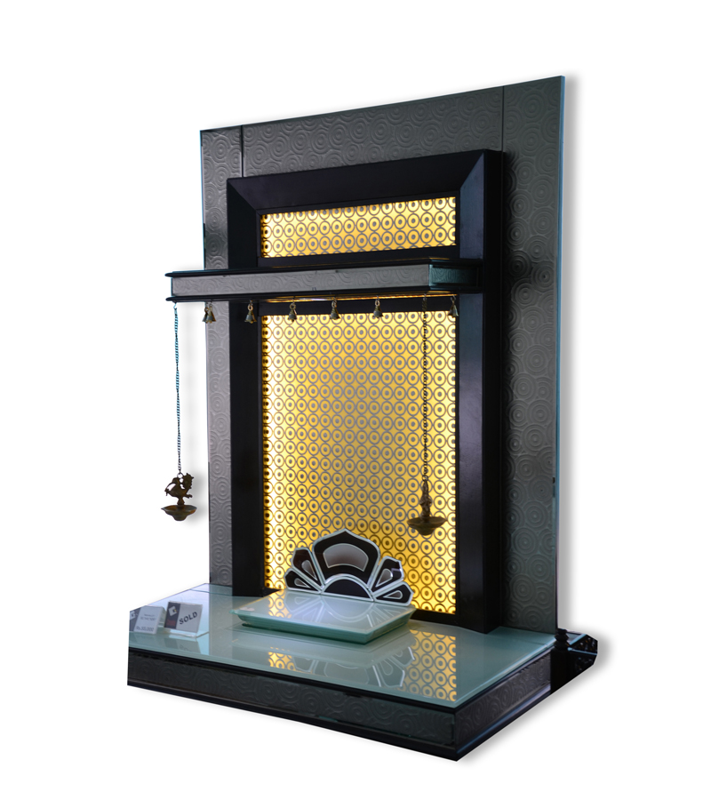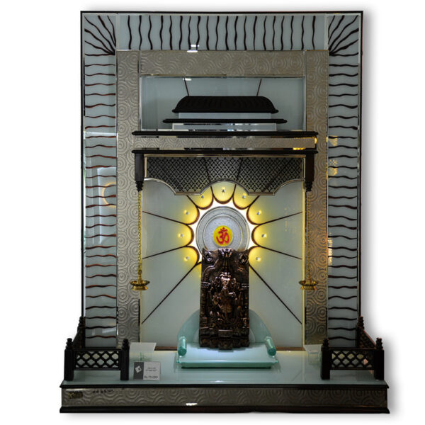 Artistic Backdrop: The outer frame features subtle circular textured patterns, ensuring the pooja ghar design looks stunning even when the lights are off.