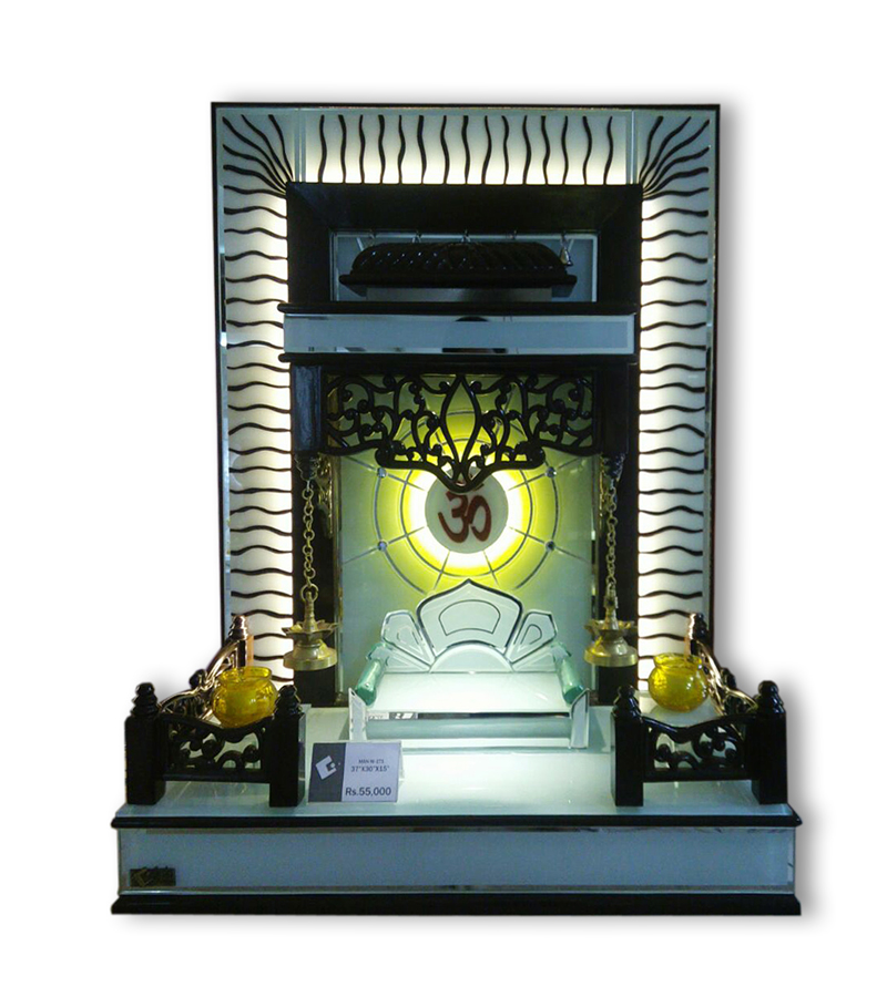 Illuminate your home with the divine glow of this contemporary wooden mandir for home. Handcrafted from high-quality teak wood and finished with an exquisite wave-etched glass frame, this pooja ghar design features a central glass pedestal and a radiant sunburst back panel, blending modern luxury with sacred tradition.