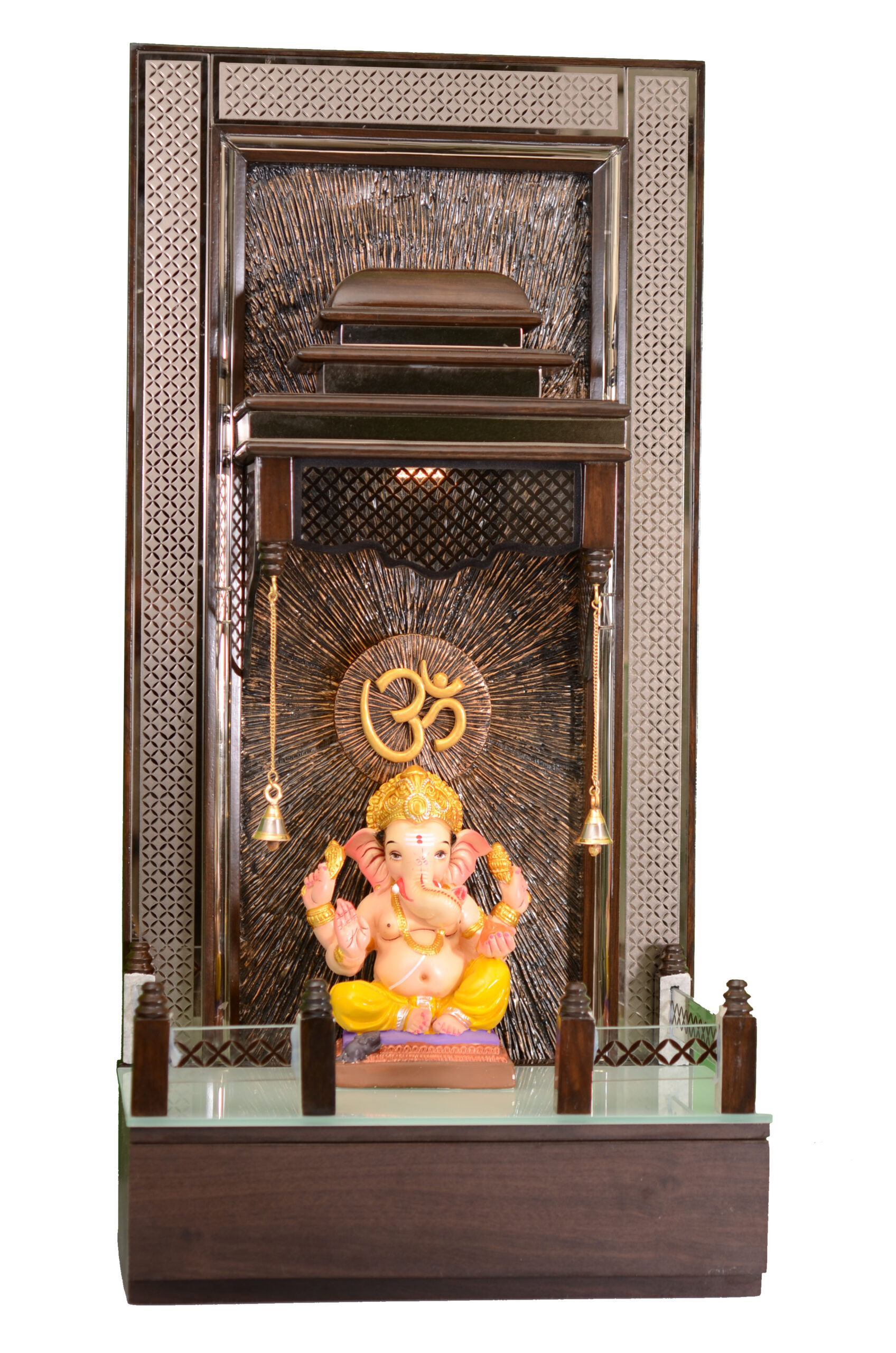 The Creata Charcoal Sunburst Series is a premier designer mandir for home that stands out through its artistic use of light and shadow. Built from 100% genuine teak wood for maximum durability, the unit features a high-gloss walnut finish that is both termite-resistant and elegant.