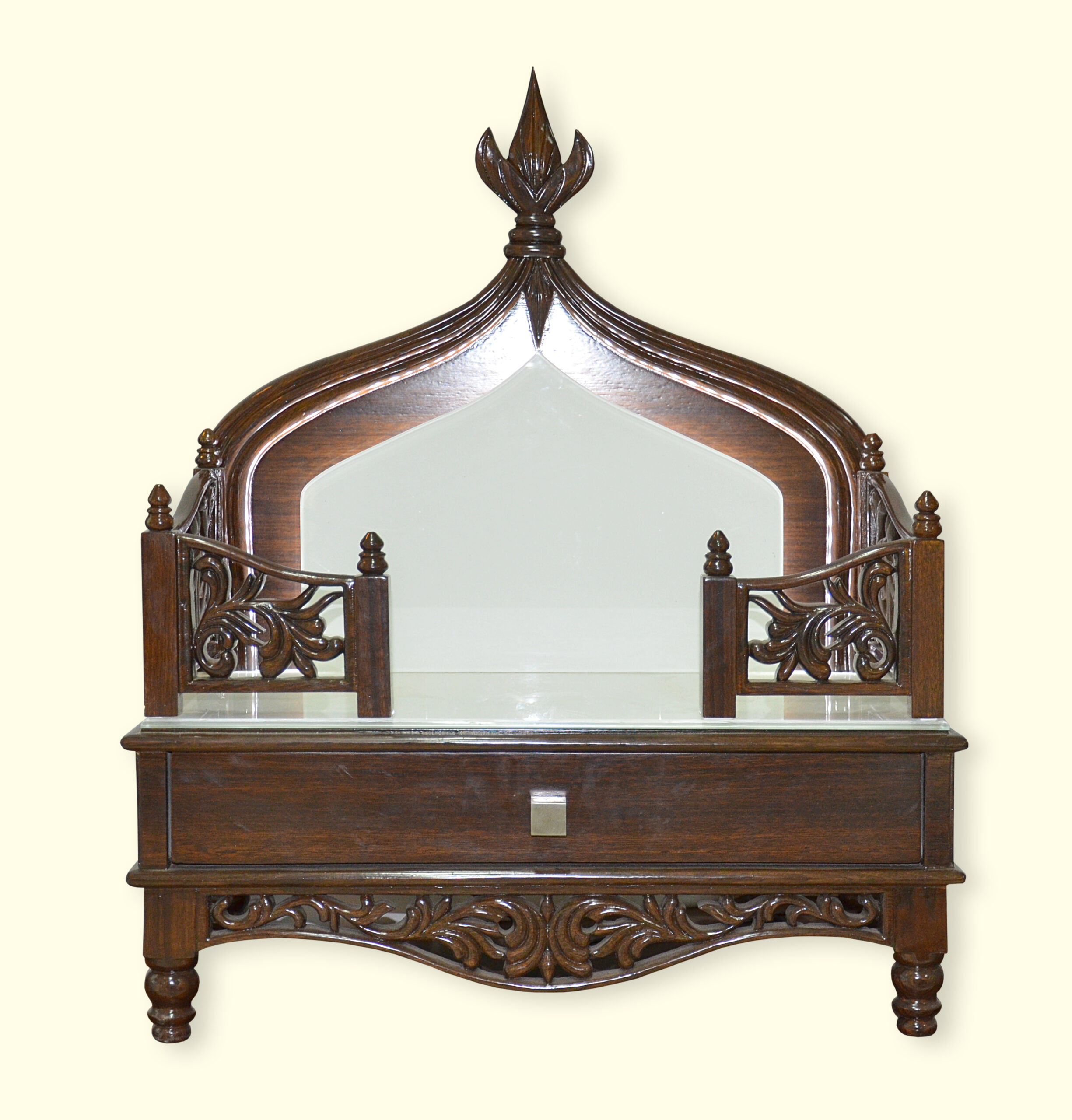 Exquisite Artistry: Features a stunning arched backrest with hand-carved floral patterns and a tiered finial, showcasing the signature style of a Designer Carved Devpaat.