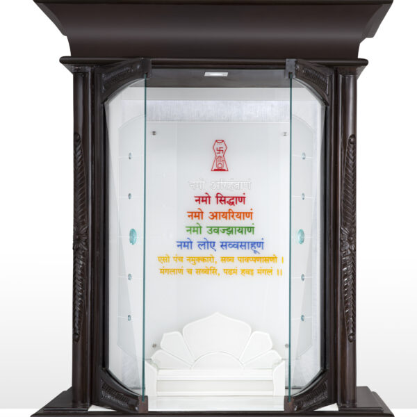 Creata Poojaghar Teak Wood Designer Carved Mandir – Premium Jain Home Temple with Namokar Mantra & Glass Doors
