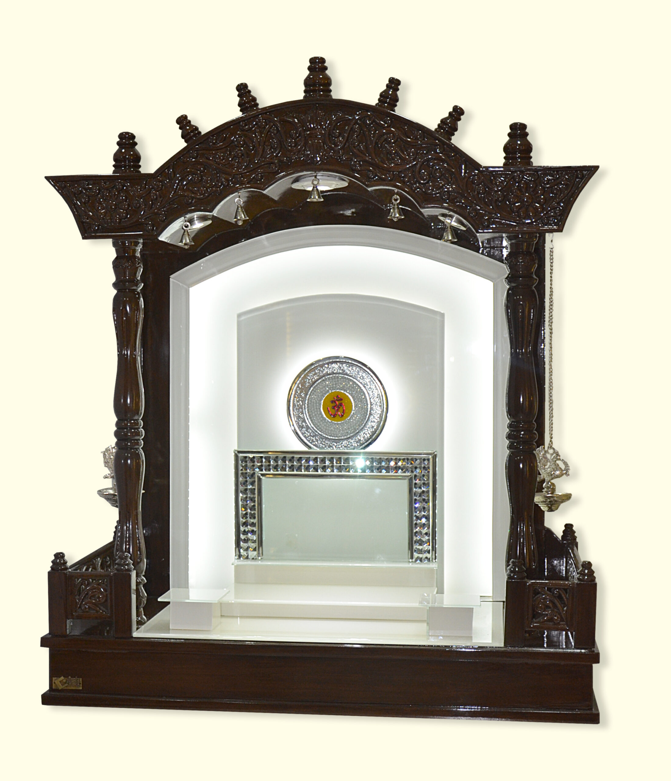 The Creata Royal Series offers a magnificent designer mandir for home that stands as a testament to fine Indian craftsmanship. Carved from solid teak wood known for its spiritual significance and durability, this temple features a wide, ornate arch (Toran) supported by elegantly turned pillars.