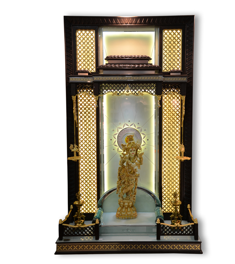 The Creata Sovereign Series represents the pinnacle of a designer mandir for home. Built from 100% genuine, seasoned teak wood, this temple is designed to be a heritage piece that lasts for generations. The rich dark finish is beautifully contrasted by elaborate gold-toned lattice panels that reflect a golden glow throughout the room.