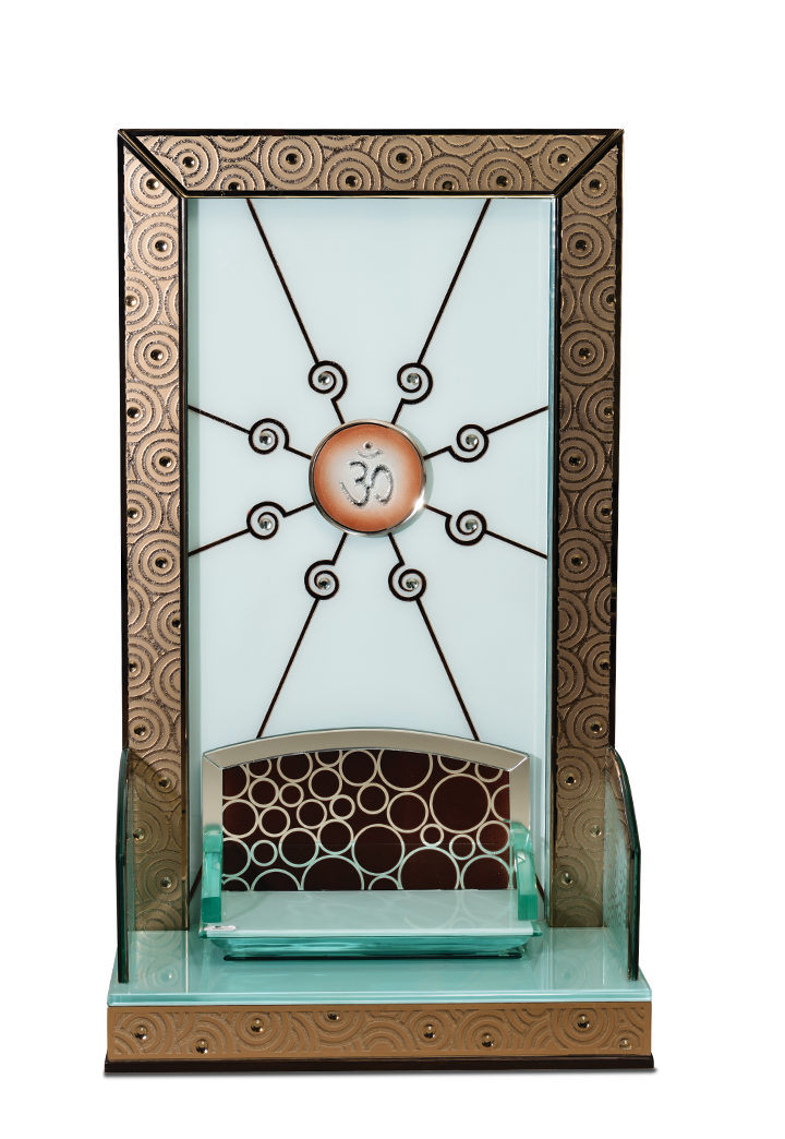 This specific mandir design for home focuses on minimalism and elegance. The back panel features a radiant “Om” symbol with sun-inspired rays extending outward, set against a pristine frosted glass background. The unit includes a stylish glass throne (pedestal) with a bubble-patterned backrest, providing a regal seat for your deities. Whether used as a floor-standing unit or placed on a console, this pooja mandir brings a sense of peace and modern artistry to your daily rituals.
