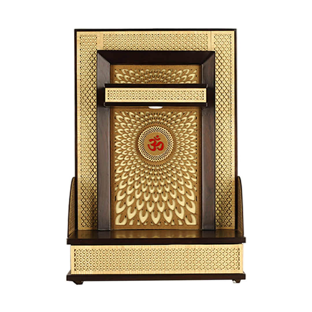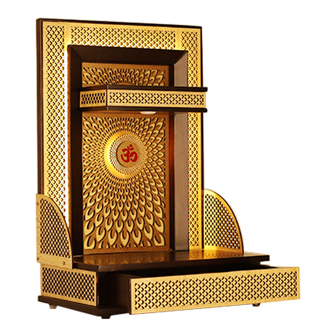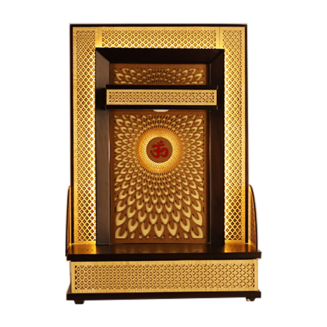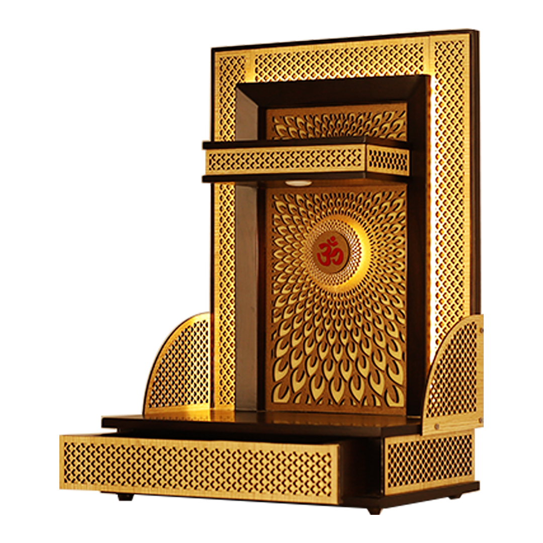 As a leader in compact mandir designs for home, this model integrates warm LED lighting that radiates through the laser-cut motifs, highlighting the central red “Om” emblem. Its dark teak finish provides a luxurious contrast to the golden-lit jaali work, making this compact temple for home a perfect centerpiece for your living room or dedicated prayer area.