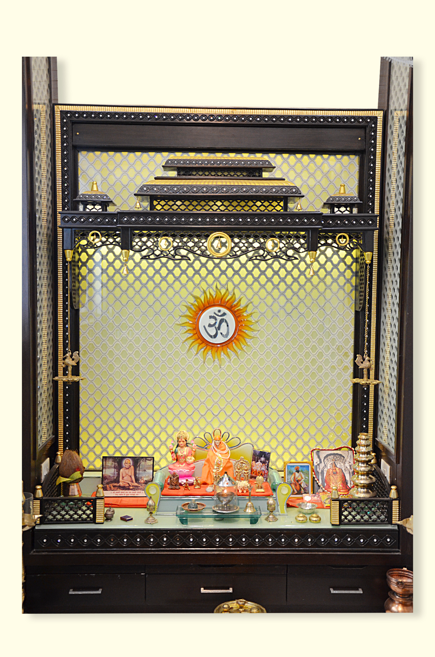 This mandir design for home stands out with its expansive 4-foot width, allowing for the comfortable placement of multiple deities and frames. The back panel is a work of art, featuring a modern yellow-lit jaali pattern that creates a bright, energetic atmosphere. The central focal point is a vibrant, sunburst-style “Om” motif that radiates divine energy throughout your puja room design.