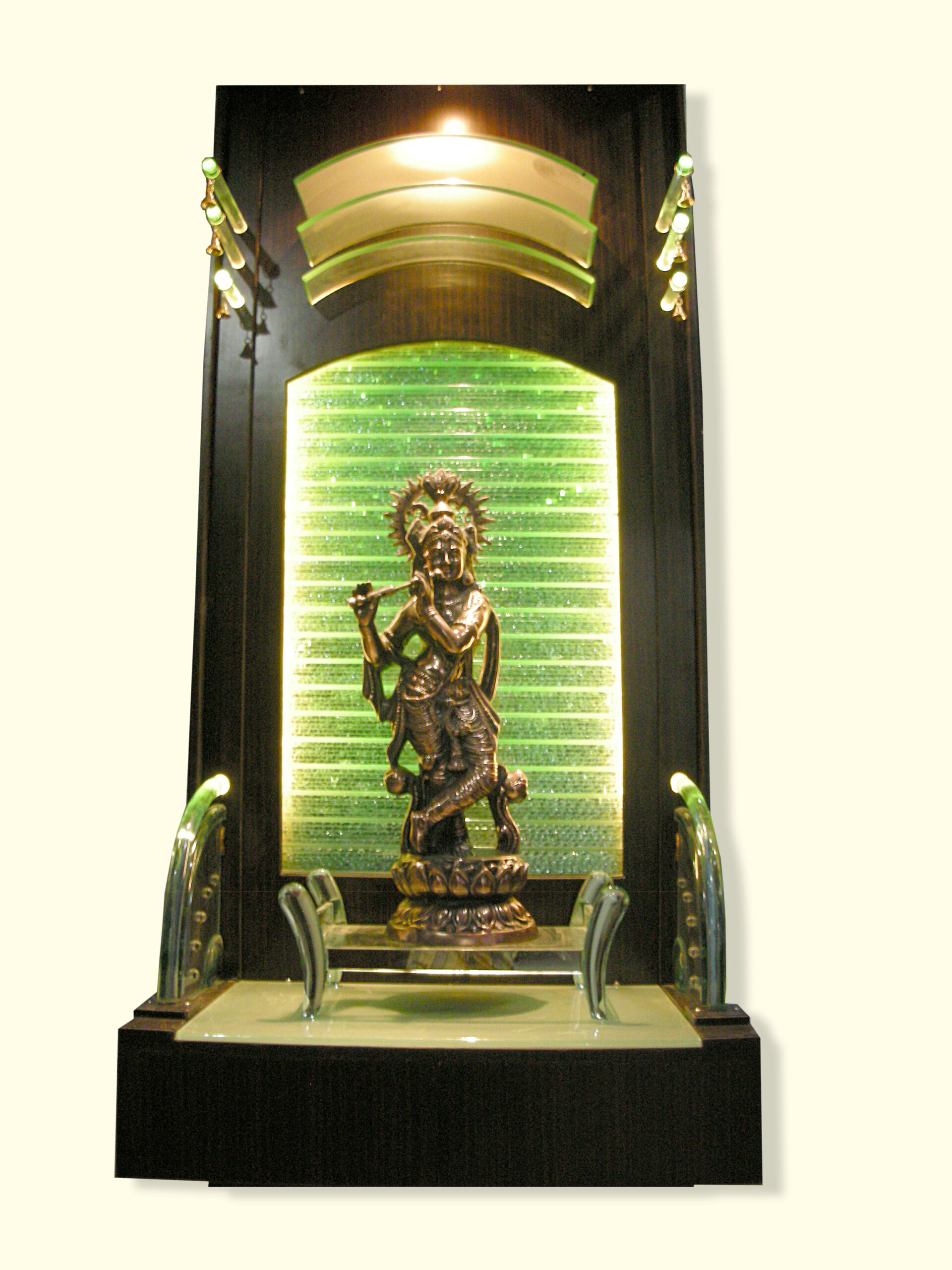 • Modern Architectural Detail: Unique three-tiered curved glass arches at the top and side-mounted glass pillars create a grand home temple design.