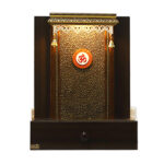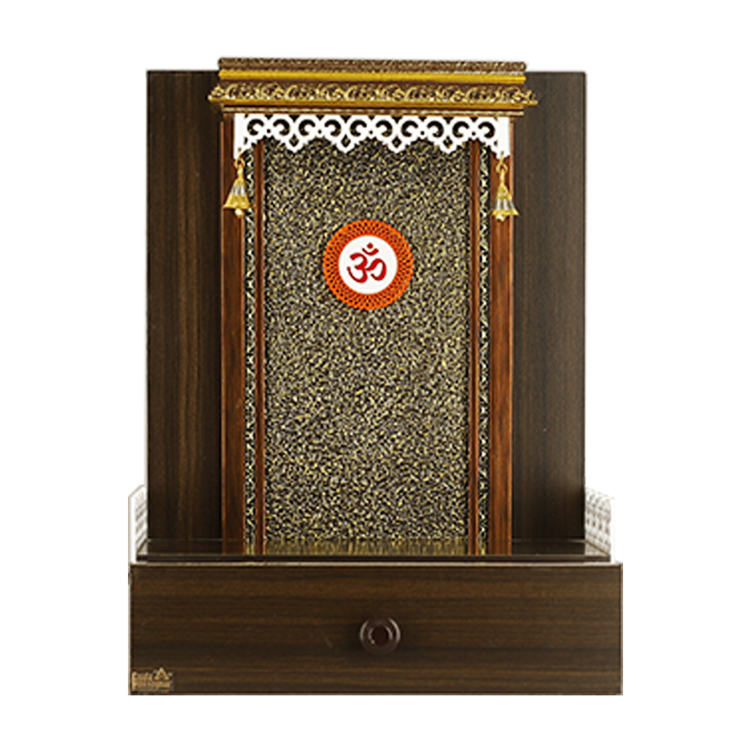 Bring home a divine aura with this masterfully crafted compact mandir for home, designed with premium teak wood for lifelong durability. This temple features a rich, dark walnut-finished frame that beautifully contrasts with its shimmering golden-textured back panel.