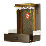 As one of the most functional compact mandir designs for home, it includes a spacious pull-out drawer at the base to keep your pooja essentials organized. The top is crowned with a traditional “shikhara” style border and features two hanging brass bells that add a touch of authentic charm. The illuminated “Om” symbol at the center makes this compact temple for home a stunning focal point for any room.