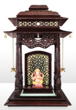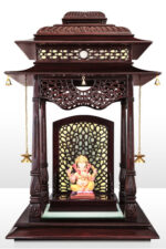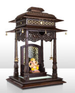 • Tiered Pagoda Roof: The grand, multi-layered “Shikhara” is adorned with detailed leaf patterns and precision carving, finished in a deep, glossy mahogany polish.