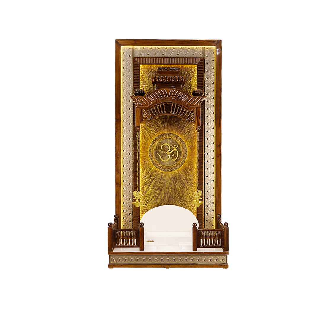 The central focal point of this mandir design for home is a brilliant, backlit sunburst panel adorned with a 3D “Om” symbol. Above the deity’s platform, a classic hand-carved dome structure provides a sense of protection and sanctity. This pooja ghar design also includes hanging brass diyas and a pristine white marble-finish base, making it a complete spiritual center for your family.