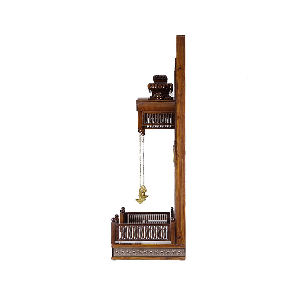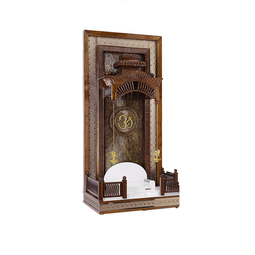 Bring home a blend of divinity and grand craftsmanship with this premium wooden mandir for home. Expertly fashioned from authentic, long-lasting teak wood, this pooja mandir is designed for those who appreciate traditional aesthetics with a modern touch. The unit stands out with its intricate multi-frame design, featuring a circular-patterned outer layer that adds immense depth and texture.