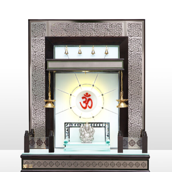 MAN-B-122 A(KP) Imperial Teak Wood Designer Mandir with Floral Etched Frame & Radiant Om