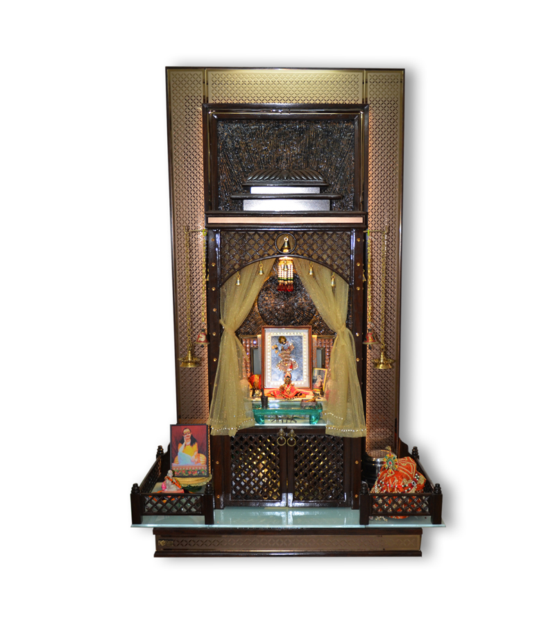 • Traditional Jaali Work: Features intricate lattice-cut doors and side railings that offer a blend of privacy and ventilation for your pooja mandir.