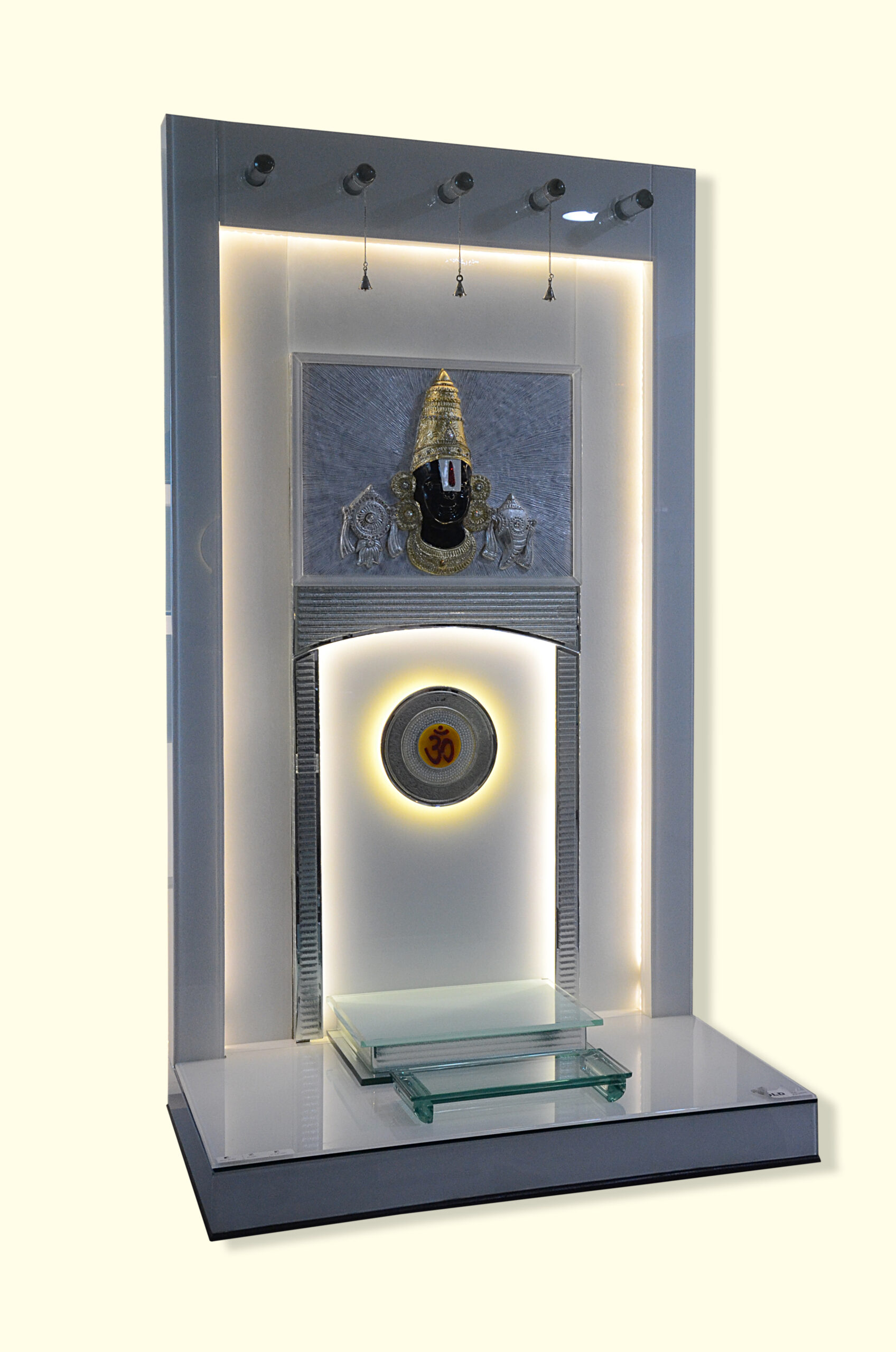 This mandir design for home stands out with its grand 4-foot height and multi-layered light-box effect. The central back panel is divided into two sacred zones: a top section featuring a beautifully detailed 3D relief of Lord Balaji with Shankh and Chakra, and a lower section with a radiant circular LED “Om” motif. The silver-textured architectural frame and integrated LED side-glow panels create a deep, meditative focus for your puja room design.