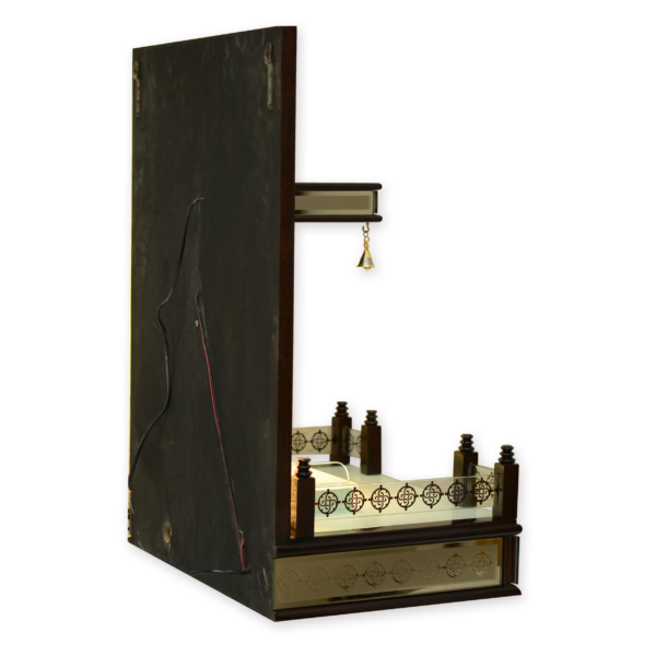 Infuse your pooja room with pleasing Wooden Poojaghar. This beautiful Poojaghar is identified with the model number KP-122-G-21. We use high-quality material to pursue such an exclusive model. UsedĀ Plywood, Teak Wood, Metal Texture, Veneer, Glass, enhances the beauty of Poojaghar followed with high Melamine Polish. It is a wall-hanging (up to 21″ width) model crafted with glass railing, drawers (up to 21″ width), brass bells. To reward the aesthetics choices of clients, we customize the Poojaghar with different sizes and accessories.