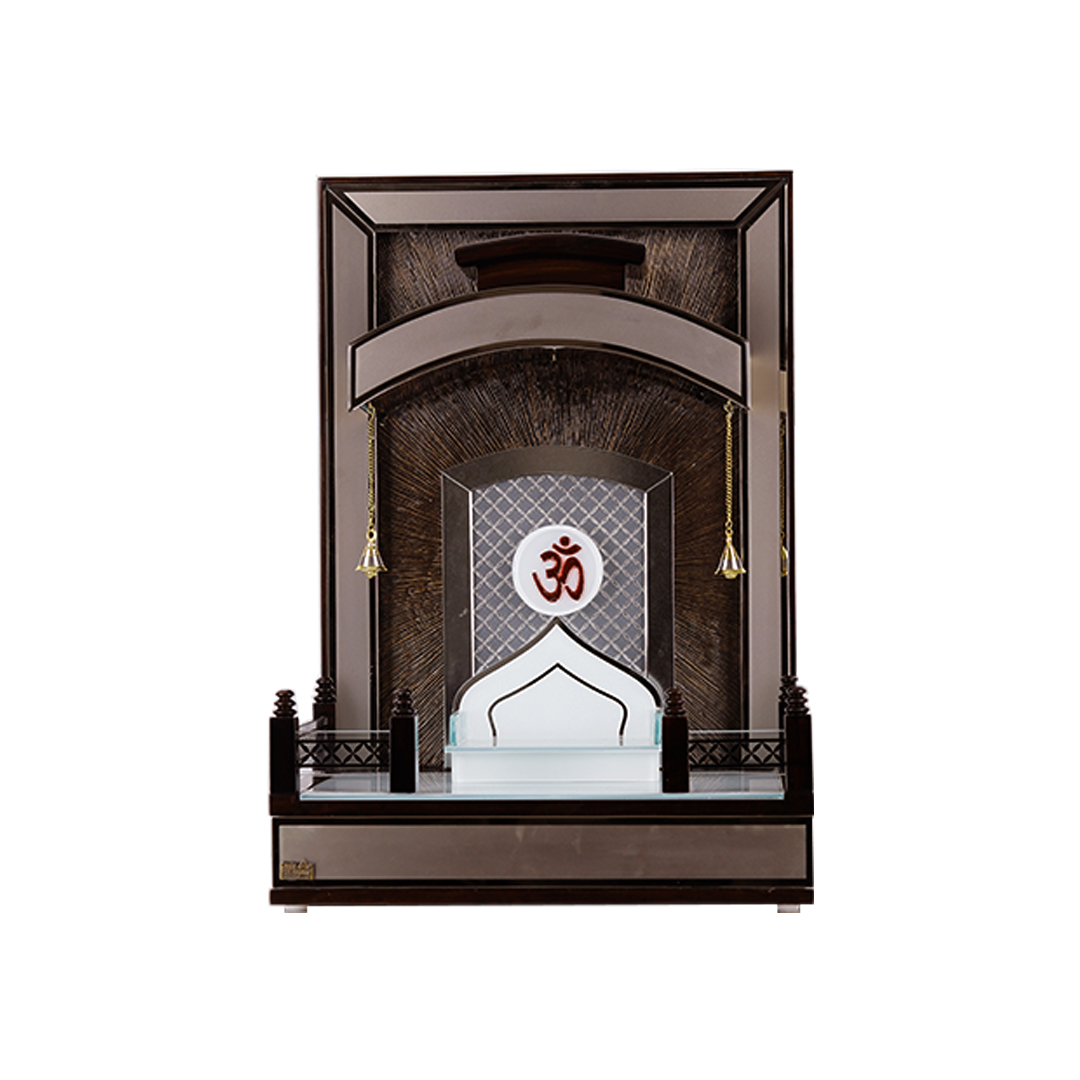 The center features a glowing “Om” emblem set against a latticed arch, creating a focal point for meditation. As one of our most elegant compact mandir designs for home, it includes delicate hanging brass bells and a sleek glass base for easy maintenance. This compact temple for home is designed to provide a luxurious spiritual experience even in limited spaces.