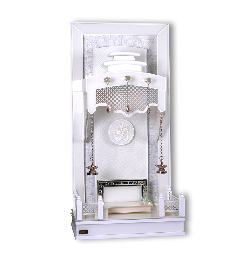 Redefine your sacred space with the MAN-W-176 designer mandir for home. Expertly carved from high-quality teak wood and finished in a brilliant white high-gloss, this pooja mandir features a majestic arched canopy, silver-toned hanging diyas, and an illuminated ‘Om’ center. It is the perfect wooden mandir for home for those who value elegance and a clean, modern aesthetic.