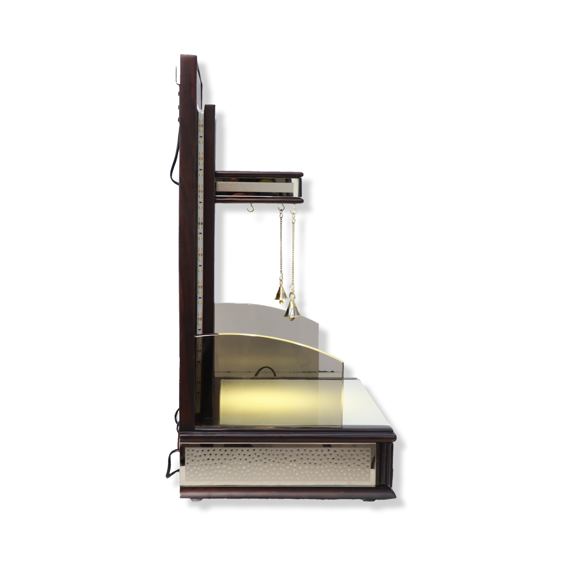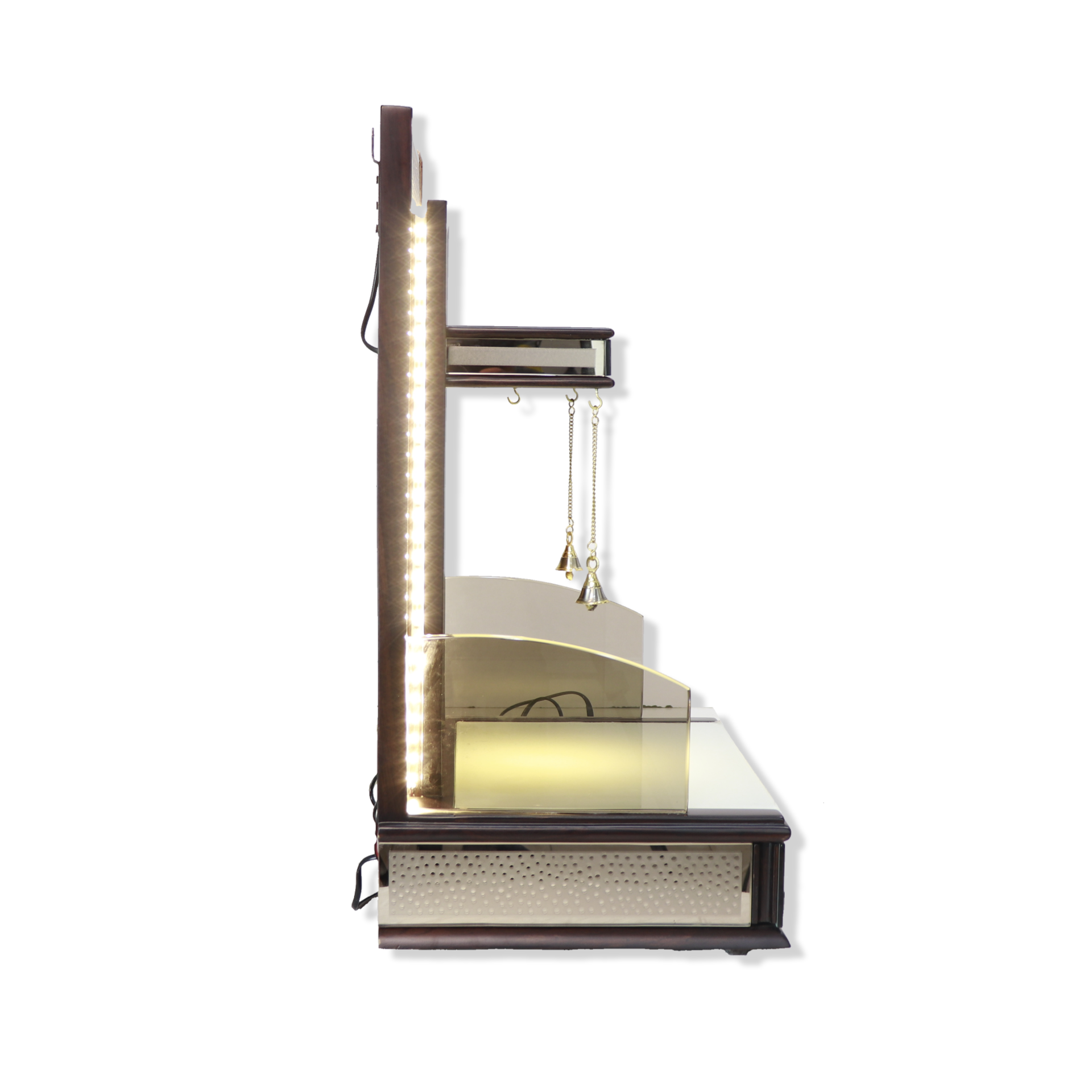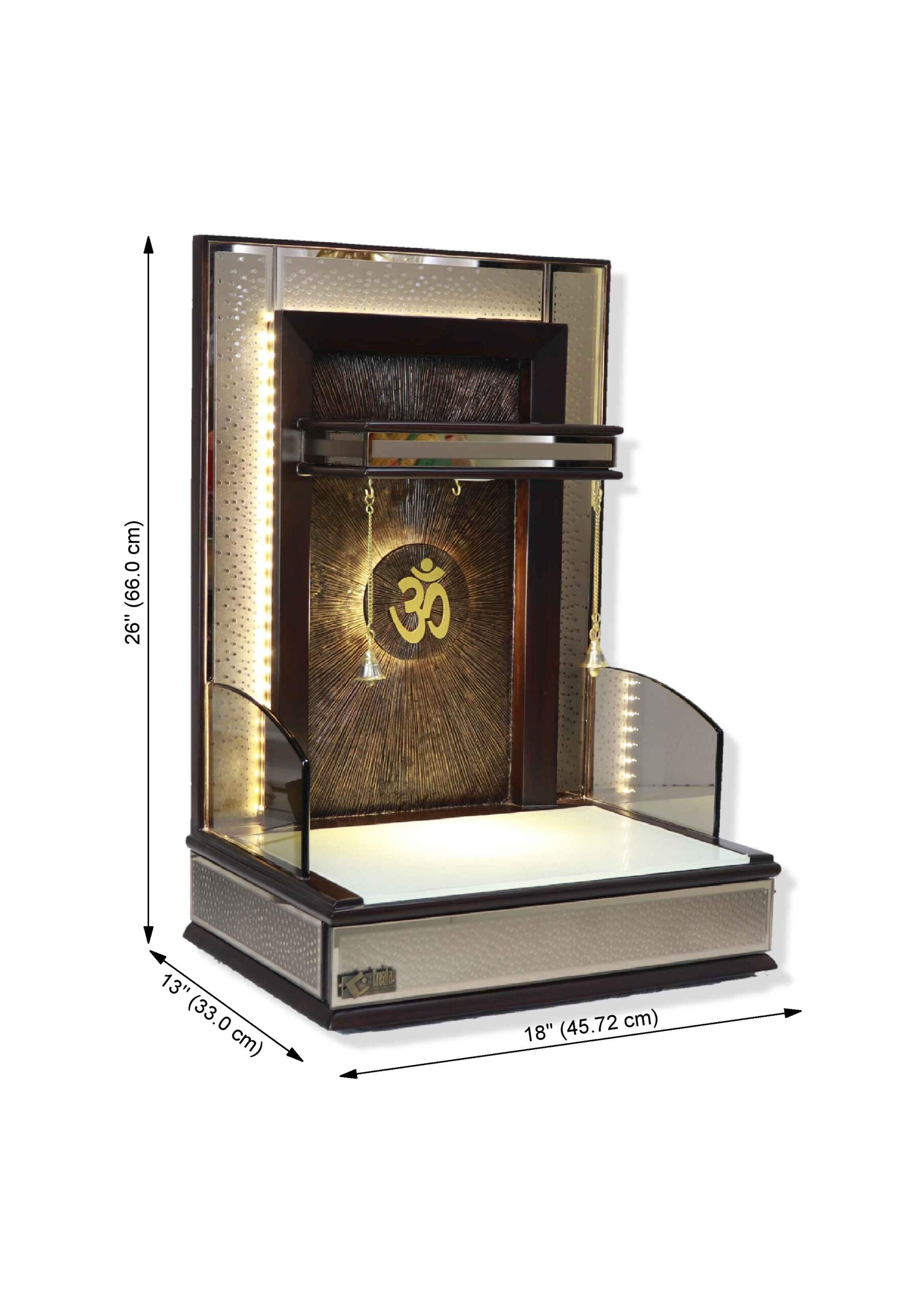 • Modern Aesthetics: Features a high-gloss silver mirror finish on the base and back frame, creating a contemporary pooja mandir design.