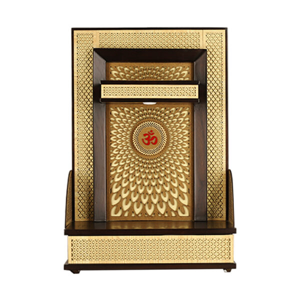 • Artistic Craftsmanship: Durable wooden wall mounted mandirs featuring detailed CNC jaali work and symbolic emblems.