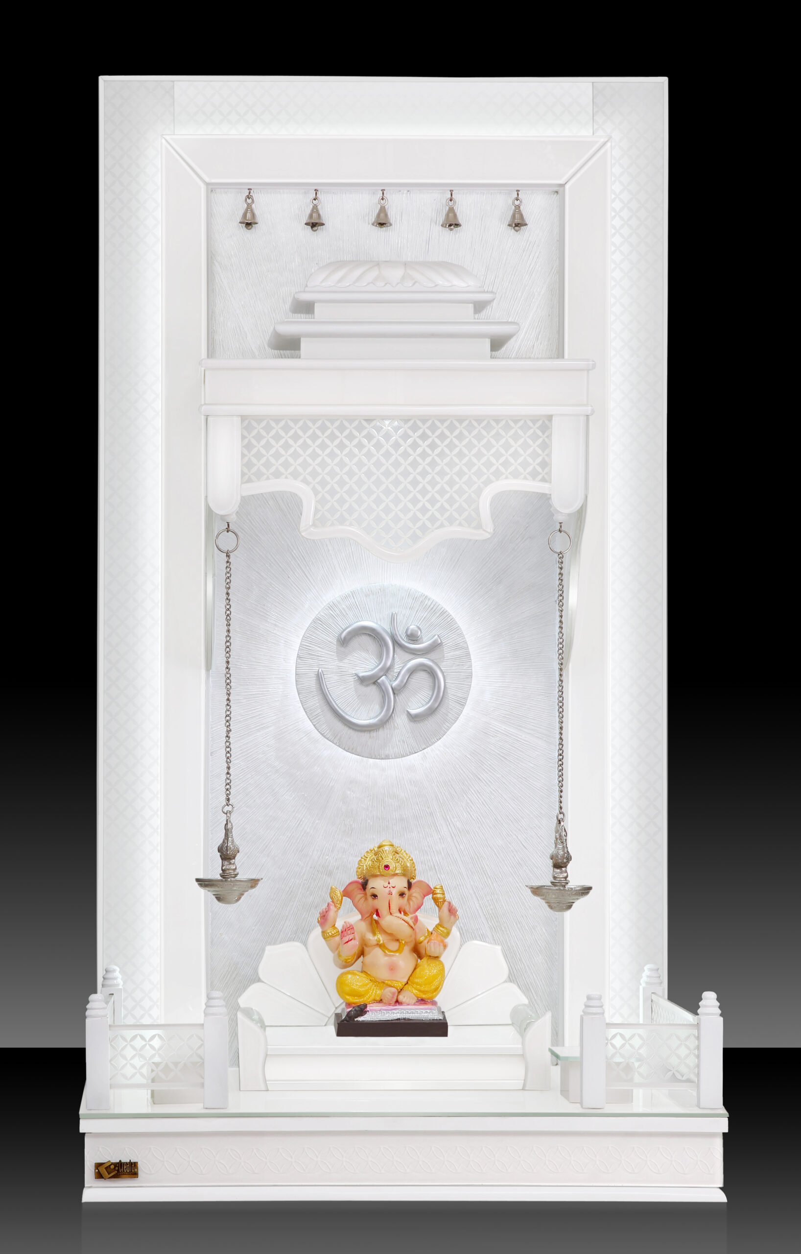 Traditional Silver Accents: To complement the white finish, this designer mandir for home includes silver-toned hanging diyas and decorative bells that add a classic melodic charm to your rituals.