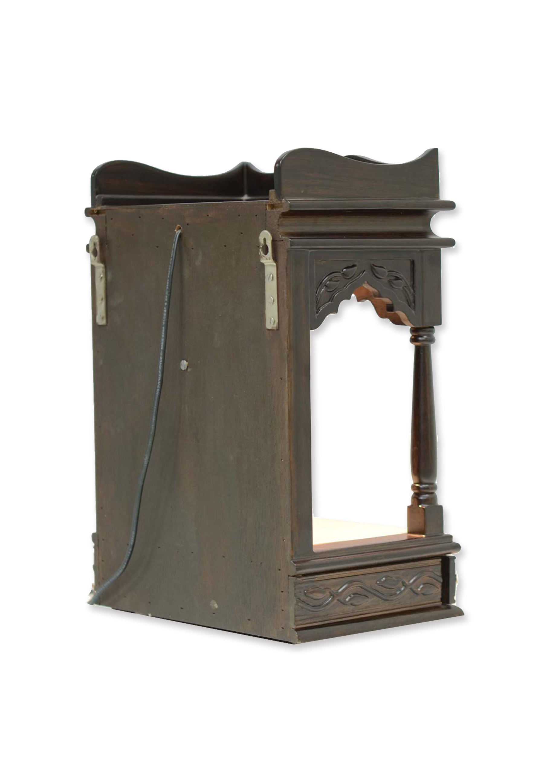 Invite peace and prosperity into your living space with this elegantly handcrafted compact mandir for home, made from high-quality teak wood. This open-pillar model is designed to provide a 360-degree view of your deity, featuring detailed leaf-motif carvings on the crown and base that showcase superior craftsmanship.