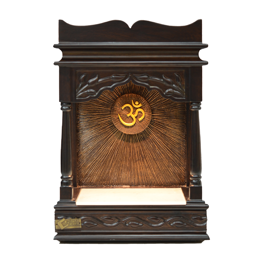 The back panel boasts a radiant sunburst texture with a golden “Om” emblem that glows beautifully under the integrated warm LED lighting. As one of the most versatile compact mandir designs for home, its rich dark polish and sturdy pillars make it a timeless addition to any prayer room. This compact temple for home is perfectly sized for wall mounting or tabletop placement in modern apartments.